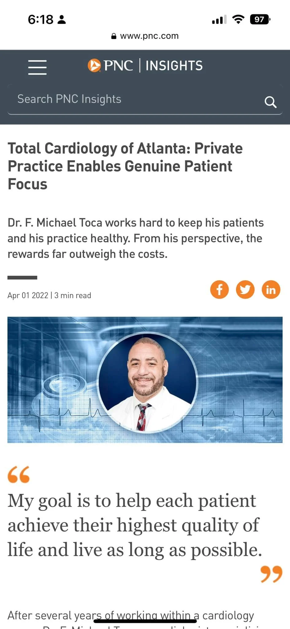 F. Michael Toca, M.D. is a Cardiologist and Cardiac Electrophysiologist. He takes care of all aspects of heart disease and specializes in heart rhythm disorders. He is the executive managing physician at Total Cardiology of Atlanta. He strives to make sure as a practice we take a holistic approach to each patient and treat each patient as an individual. Total Cardiology of Atlanta was founded in February 2015 to promote cardiology care to patients to look at each patient as an individual and not an illness.
